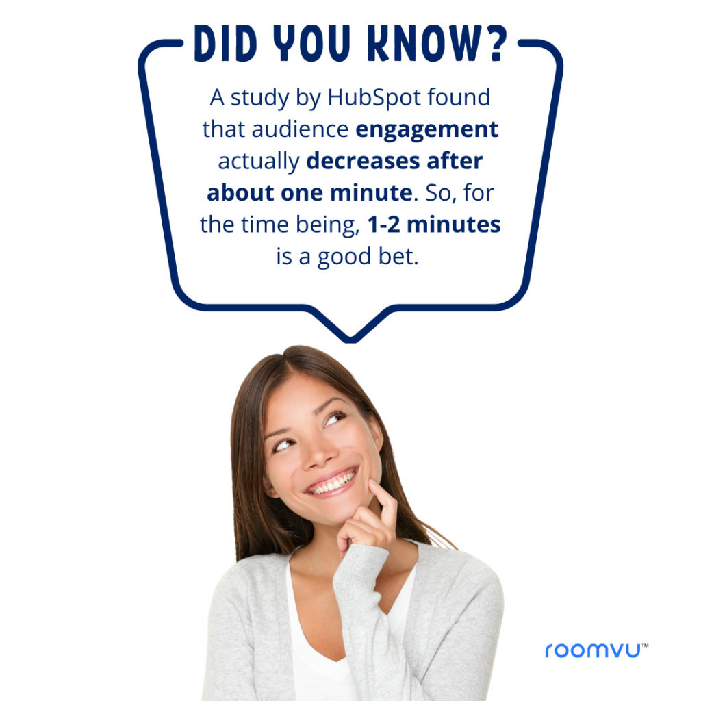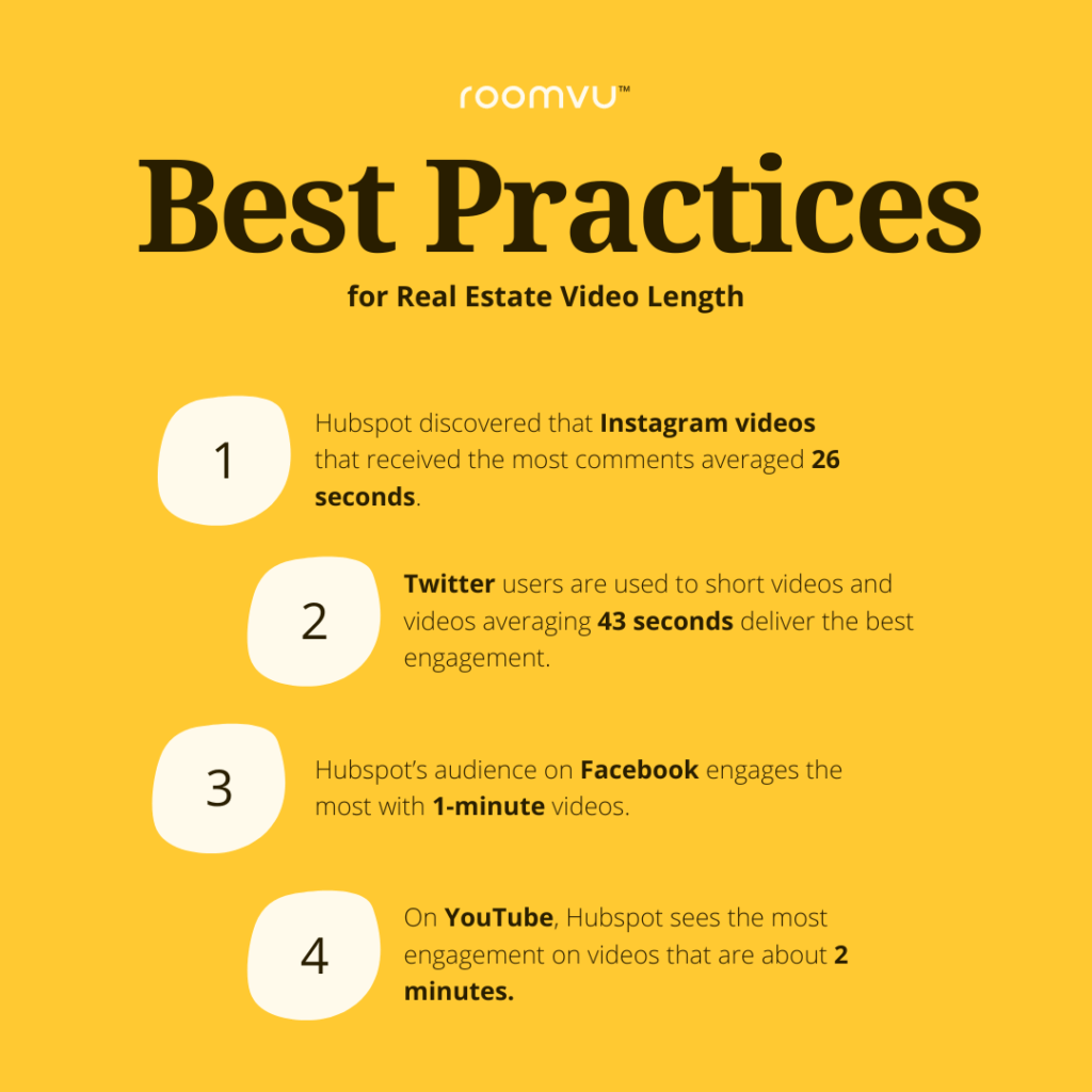 According to a study done by roomvu, the optimal length of videos is between 70 and 90 seconds for effective engagement and impression. Agents, however, prefer longer videos.
