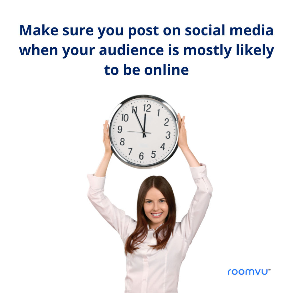 Baes on our data on the roomvu dashboard we found that agents should post from 8:00 a.m. to 12:00 noon (PST). This time period tends to generate the highest amount of engagement.