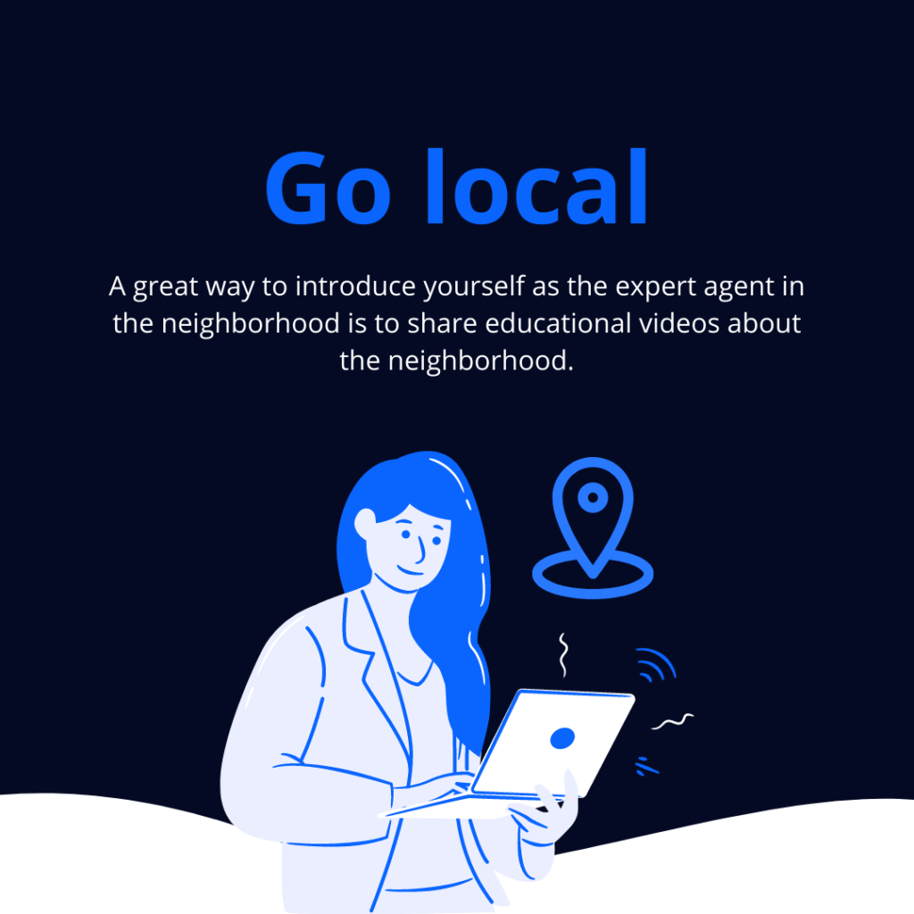 A great way to introduce yourself as your neighborhood’s “Digital Mayor” is to share educational videos about the community and cover different topics like amenities, jobs, schools, transportation, etc. You become the go-to guy in the neighborhood who knows the area like the back of their hand.
