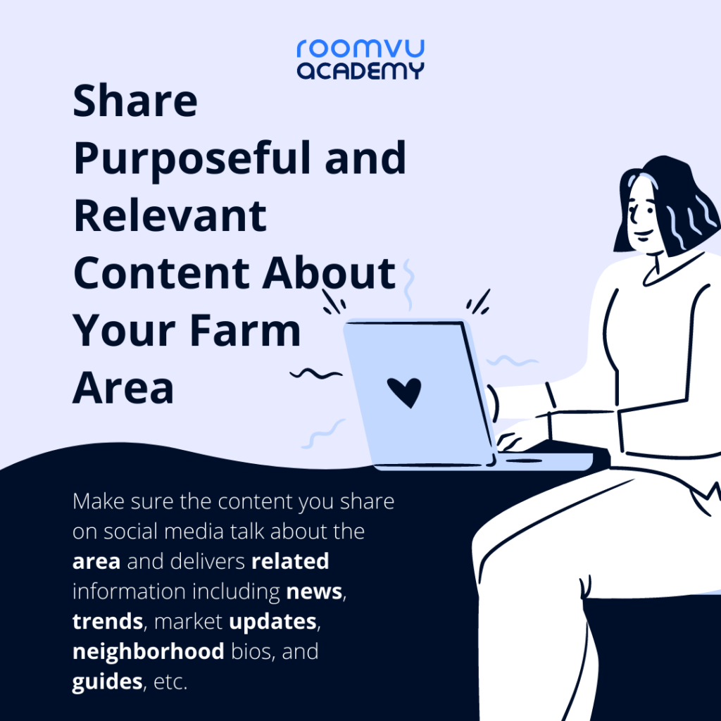 Real estate is a very local business; the best way to help your prospects is by keeping it local. Your area can be spread across a neighborhood or a city. Make sure the content you share on social media talks about the area and delivers related information, including news, trends, market updates, neighborhood bios, guides, etc.