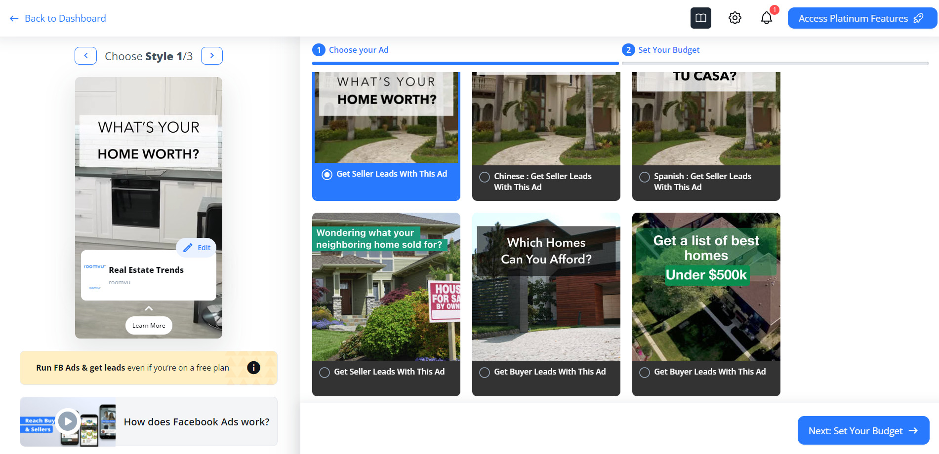 roomvu SMART ADS is your ultimate solution to run real estate ads on social media. It is an all-in-one package that takes of everything you need to run ads: the content- messaging, creative, landing pages, targeting, you name it. All you need to do is define your budget and press done.