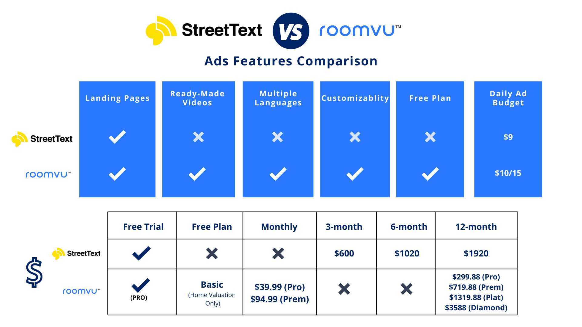 One quick way to get Real Estate leads is to run ads. Google Ads might sound like the ideal option but since the competition is too high, agents had better try running ads on social media like Facebook and Instagram which are more cost-effective. Street Text is one online service that promises to help agents run better ads on Facebook. Therefore we decided to compare Street Text vs roomvu smart ads.