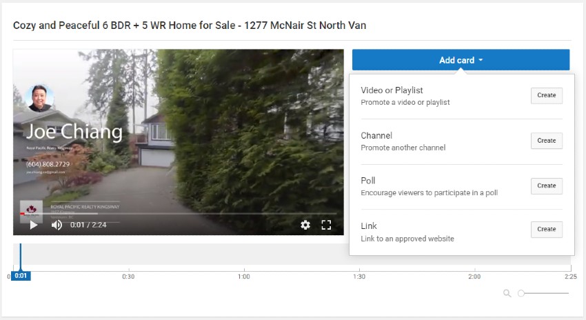 You may also use Cards in this section. They are used to make your videos more interactive. These cards act as links and CTAs that link visitors to other sites and videos. The longer you keep users on your channel and content, the better the chances of convincing them you’re the right agent to work with.