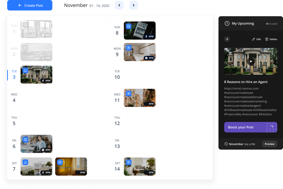 Creating a content calendar requires a lot of effort and research. Sticking to the calendar is another story as well. We at roomvu realized this is one of the biggest pains real estate agents have. Therefore, we created an all-in-one social media content calendar for real estate. However, the value proposition behind this calendar is not the planning. We also take care of the content for real estate agents.