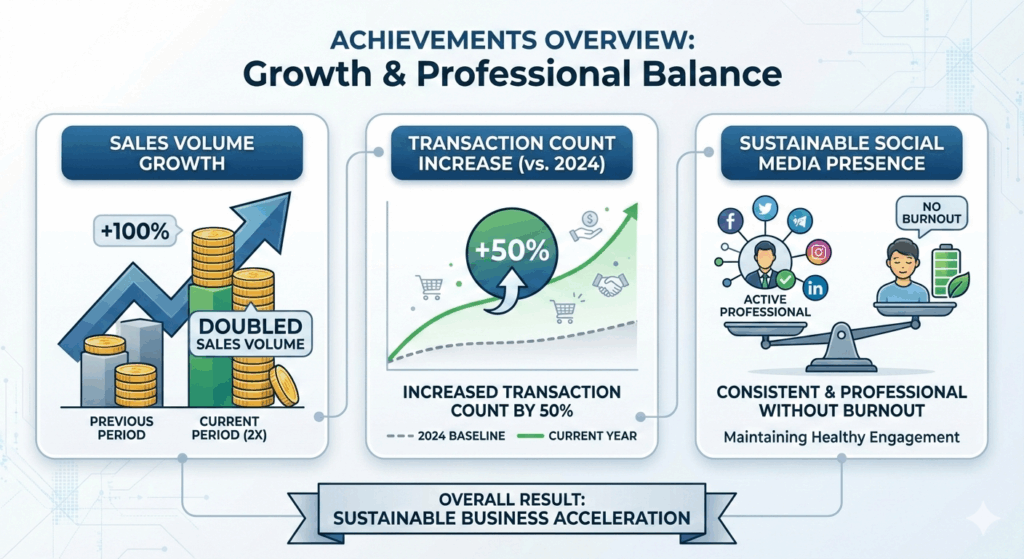 Instead of pushing harder, Nick leaned into systems that worked in the background. His social presence continued compounding reach, engagement, and recognition while he focused on clients and personal matters.