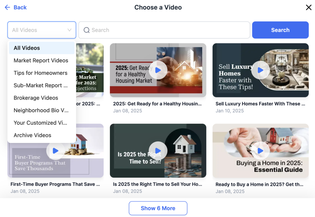 2. Choose a recurring video: This option allows you to select a video that will be shared monthly as soon as it is published (e.g., market update videos for your region). Set it up once, and roomvu will handle the monthly sharing for you automatically.