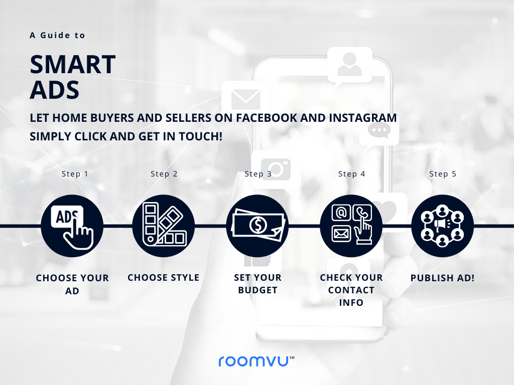 roomvu SMART ADS is your ultimate solution to run real estate ads on social media. It is an all-in-one package that takes of everything you need to run ads: the content- messaging, creative, landing pages, targeting, you name it. All you need to do is define your budget and press done.