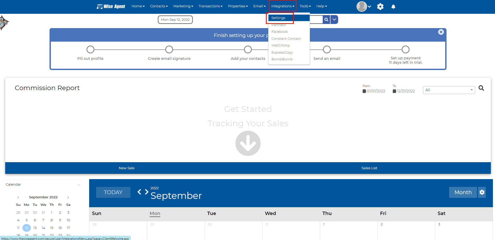Log in to your WiseAgent account and click on “Integration” in the top middle section of the main page. Then select “Settings”.