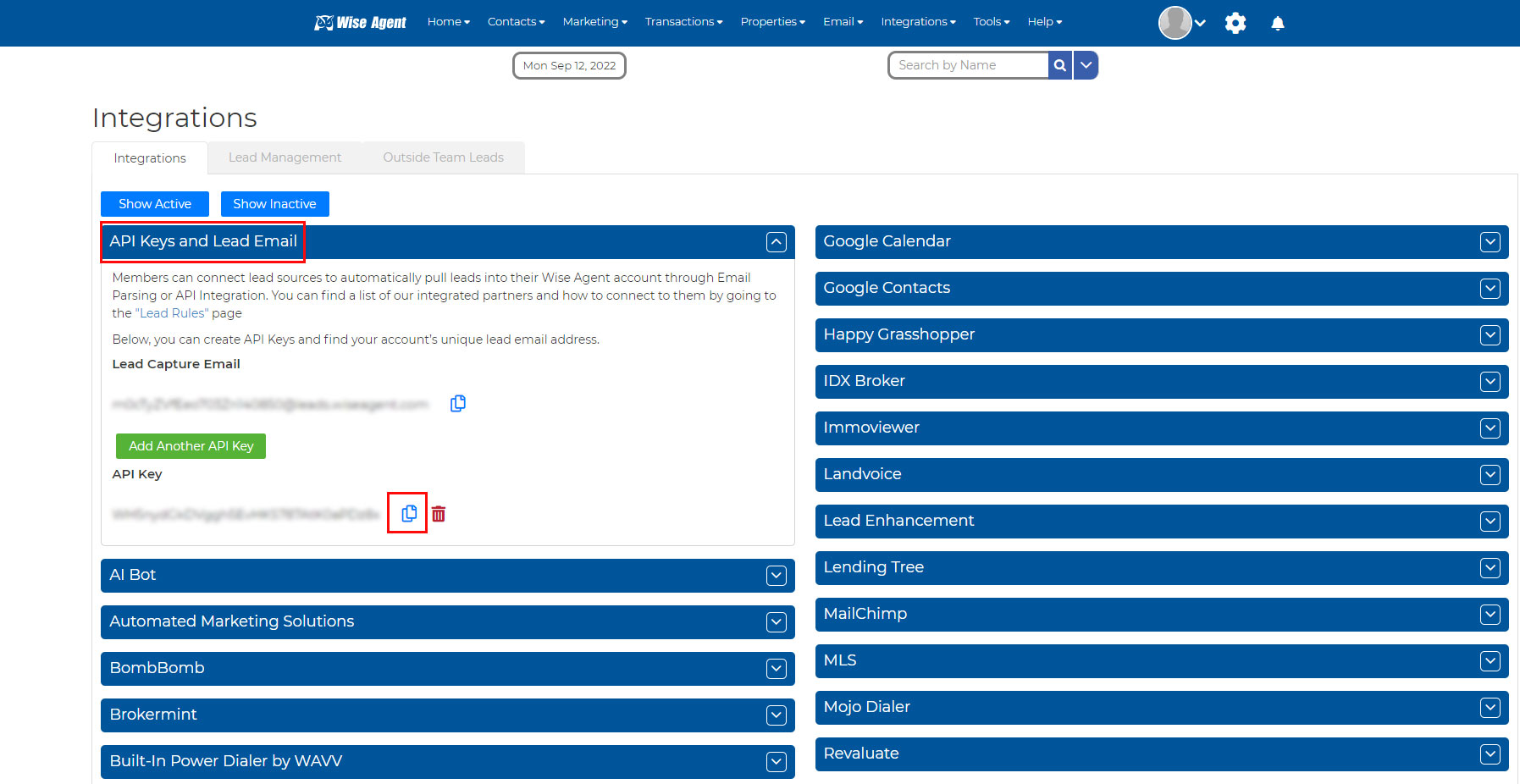 On the next window, Click on “API Keys and Lead Email” to open its drop-down menu. Now under “API Key” click on the copy icon to copy your key.