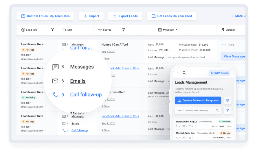 You will have access to the Roomvu comprehensive leads management Dashboard. Here you can manage your leads, put them on automated plans and see where you are in the process.