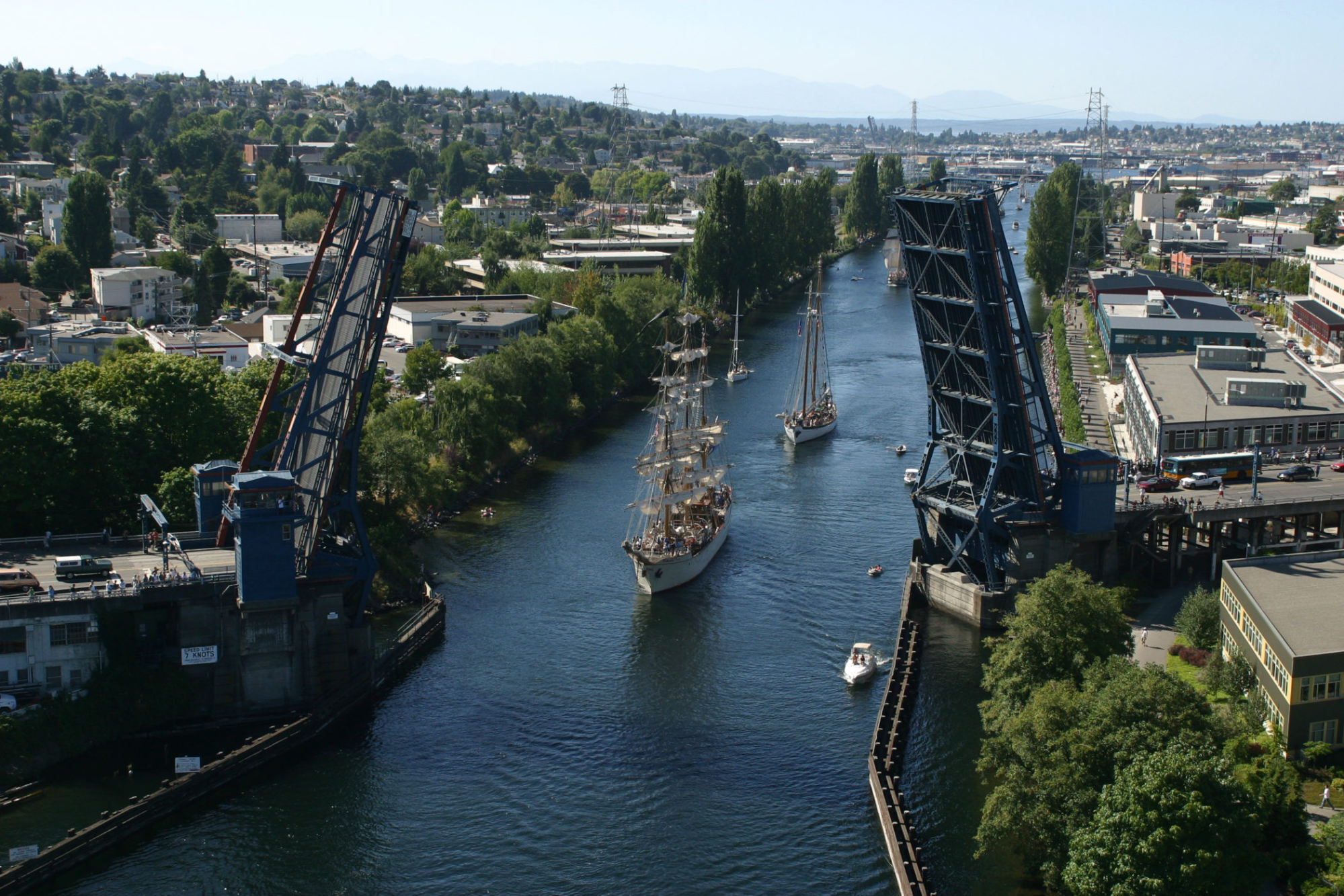 As the Native travelers illustrated, connecting saltwater and freshwater made sense, except for one large problem. Lake Washington was about 29 feet, and Lake Union about 20 feet, above sea level, while Salmon Bay was a tidal inlet with a water level that fluctuated 10 to 12 feet daily.” The Ship Canal opened in 1917 connecting the saltwater of Puget Sound to the freshwater of Lake Washington via Lake Union. It consists of two cuts, the Fremont Cut between Salmon Bay and Lake Union and the Montlake Cut between Lake Union and Lake Washington, and a set of locks at the west end of Salmon Bay. The Hiram M. Chittenden Locks accommodate approximately a 20-foot (6.1 m) difference in water level between Lake Washington and the sound.